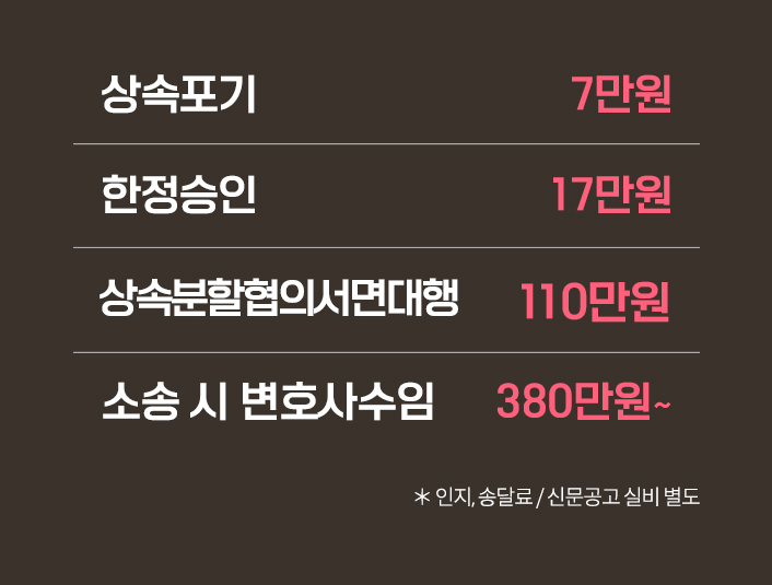‘채무상속’으로 고통받는 사람들이 또다시 상속포기 비용에 대한 부담으로 법률상담을 주저하는 게 정말 아이러니합니다.그래서 본사는 누구에게나 부담 없는 비용만 책정해서 도와드리고 있습니다.비용에 대한 자세한 안내는 아래 글을 대신하겠습니다.