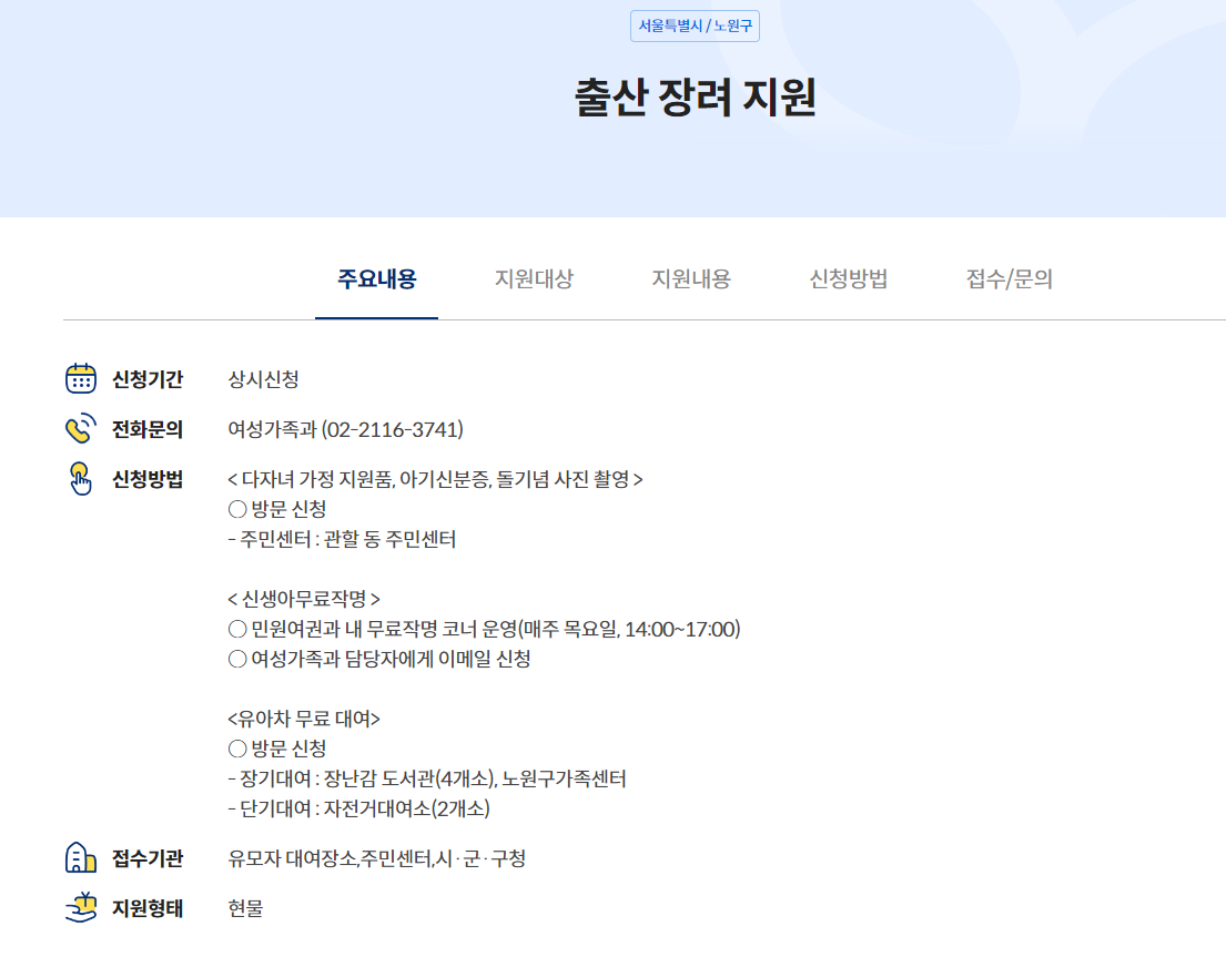 2) 출산장려 지원 ※ 담당기관 : 서울시 노원구